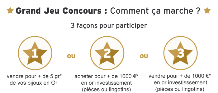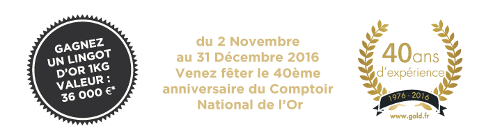 * Jeu Concours avec obligation d'achat. Tirage au sort devant huissier le 02 février 2017. Une seule participation par personne et par famille. Pièce d'identité obligatoire. Plus de renseignement dans les agences Comptoir National de l'Or participantes.