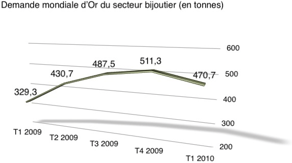 La demande globale du secteur bijoutier s'est en effet fortement ressaisie au T1 2010 à 470,7 tonnes d'Or, en comparaison des faibles niveaux enregistrés en 2009. Ce vif ressaisissement a été en grande partie dû à la reprise indienne, ainsi que dans une moindre mesure, à d'autres marchés comme le Moyen Orient, Hong Kong et l'Asie du Sud ainsi que la Russie. Par opposition, les marchés occidentaux ont souffert d'une contraction de la demande alimentée par l'élévation du prix de l'Or et des troubles économiques conjoncturels.