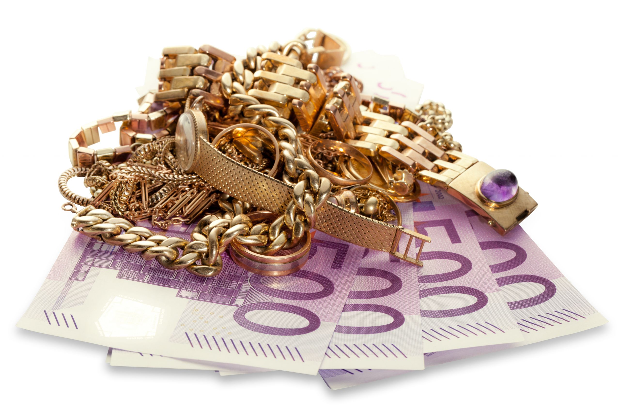Gold chains, bracelets and rings spread on European monetary. Scrap Gold vs. Money.
