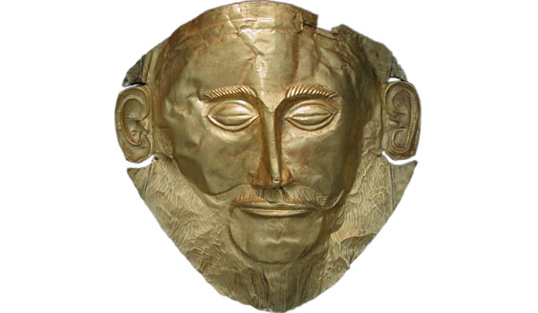 Le masque en or d’Agamemnon est en fait un masque funéraire. Découvert par Heinrich Schliemann en 1876 à Mycènes, il s’est avéré que ce masque n’était pas celui du roi Agamemnon, chef des Achéens dans le cycle troyen. Cependant, il garda le nom de masque d’Agamemnon malgré le fait qu’il date de 1550-1500 av. J-C, autrement dit plusieurs siècles avant la période supposée de la guerre de Troie. Outre le masque d’Agamemnon, on retrouva dans la tombe à fosse, 4 autres masques ; 3 dans la tombe IV et 2 dans la tombe V. Par contre dans la tombe III les visages et les mains des deux enfants découverts, étaient recouverts de feuilles d’or. En sus du masque en or, d’importantes quantités d’or et d’objets façonnés furent trouvés dans les tombes. Les spécialistes en déduisent que cela avait un rapport avec le statut et la caste des morts. Cependant, depuis quelques dizaines d’années, on remet en cause l’authenticité du masque. En effet, certaines personnes, se basant sur le fait que Schliemann avait pour habitude de placer des artéfacts dans les endroits de fouilles, émirent comme hypothèse que l’archéologue avait fait fabriquer le masque sur le modèle de masque mycénien. D’autres basent leurs « accusations » sur l’argument que le modèle du masque ressemblait à l’empereur Guillaume Ier et que Schliemann avait ordonné sa fabrication pour plaire au souverain. Les doutes concernant l’origine du masque d’Agamemnon continuent de subsister. Cela dit le masque reste tout de même une œuvre exceptionnelle de par sa composition en matériau précieux et la précision de sa sculpture.