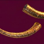 Sans doute la plus célèbre découverte relative à la préhistoire danoise, les cornes d’or de Gallehus datent des environs du Vème siècle, soit le début de l’âge du fer germanique. Les cornes d’or de Gallehus sont décorées de motifs nordiques et romains. Le poids des 2 artéfacts s’élève à peu près à 7 kilos. La plus longue des deux cornes a été trouvée en 1639 à Gallehus au Danemark. Quelques mètres plus loin, la deuxième corne, la plus courte, fut trouvée en 1734. En 1802, on vola les deux cornes. Des dessins représentant les cornes et datant du XVIIème et du XVIIIème siècle permirent de faire des copies. Cependant, des incertitudes demeurent concernant plusieurs détails. Les copies faites entre 1859 et 1860 sont trop larges mais montrent probablement la vraie taille des cornes. L’histoire de la corne à boire remonte à l’antiquité classique, en particulier dans la Thrace et les Balkans. Au Moyen-âge et plus tard dans quelques parties de l’Europe, plus précisément en Europe germanique et dans le Caucase, la tradition des cornes à boire fut dédiée à des fins cérémoniales. C’est à l’époque des vikings, qui buvaient entre autres dans des cornes de bovins domestiques et de chèvres, qu’on développa tout un art lié à la corne à boire. En effet, on remarqua qu’au fil du temps la plupart des cornes à boire norvégiennes relevaient de l’art de l’orfèvrerie. Ces objets utilisés lors des fêtes et des célébrations étaient montés sur des structures métalliques et ornés de pierres précieuses. Les cornes d’or de Gallehus sont un exemple typique de ce genre de créations artistiques.