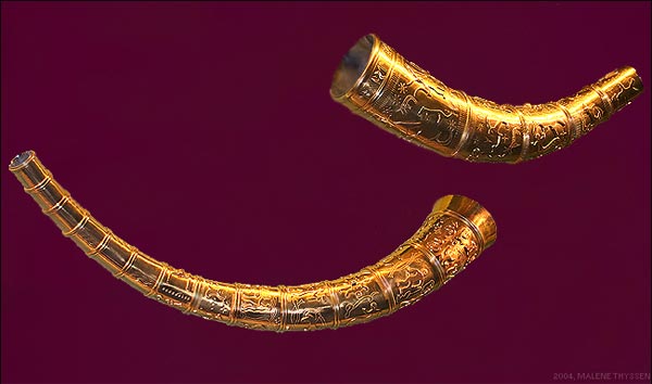 Sans doute la plus célèbre découverte relative à la préhistoire danoise, les cornes d’or de Gallehus datent des environs du Vème siècle, soit le début de l’âge du fer germanique. Les cornes d’or de Gallehus sont décorées de motifs nordiques et romains. Le poids des 2 artéfacts s’élève à peu près à 7 kilos. La plus longue des deux cornes a été trouvée en 1639 à Gallehus au Danemark. Quelques mètres plus loin, la deuxième corne, la plus courte, fut trouvée en 1734. En 1802, on vola les deux cornes. Des dessins représentant les cornes et datant du XVIIème et du XVIIIème siècle permirent de faire des copies. Cependant, des incertitudes demeurent concernant plusieurs détails. Les copies faites entre 1859 et 1860 sont trop larges mais montrent probablement la vraie taille des cornes. L’histoire de la corne à boire remonte à l’antiquité classique, en particulier dans la Thrace et les Balkans. Au Moyen-âge et plus tard dans quelques parties de l’Europe, plus précisément en Europe germanique et dans le Caucase, la tradition des cornes à boire fut dédiée à des fins cérémoniales. C’est à l’époque des vikings, qui buvaient entre autres dans des cornes de bovins domestiques et de chèvres, qu’on développa tout un art lié à la corne à boire. En effet, on remarqua qu’au fil du temps la plupart des cornes à boire norvégiennes relevaient de l’art de l’orfèvrerie. Ces objets utilisés lors des fêtes et des célébrations étaient montés sur des structures métalliques et ornés de pierres précieuses. Les cornes d’or de Gallehus sont un exemple typique de ce genre de créations artistiques.