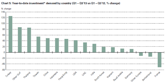 Sur l’année, la demande de lingots et de pièces d’or a progressé de 36% (332,9 tonnes) par rapport à la même période de 2012, soit 1,252 tonnes. Ce sont les investisseurs des pays d’Orient et d’Extrême Orient (la Turquie, la Chine et l’Inde) qui, motivés par des prix moyens bas, ont contribué à l’accroissement de la demande de ces produits, comme le montre le graphique ci-dessous :