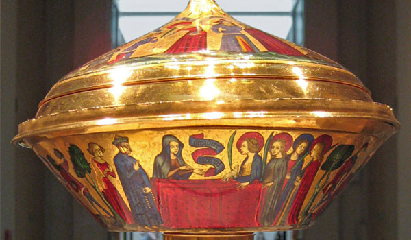 La coupe de Sainte Agnès est un hanap en or massif. Ce chef d’œuvre d’orfèvrerie mesure 23,6cm de haut et 17,8cm de diamètre pour 1,935 kg. Bien que fortement imposante, beaucoup d’ornements manquent à l’appel. En effet, le support triangulaire du couvercle s’est perdu ainsi que son fleuron décoré, la moulure décorée avec 36 perles a été retirée du bord extérieur. Toutefois, la jambe de la coupe a été prolongée par l’ajout de bandes cylindriques, le récipient gagna donc en hauteur. Les surfaces aurifères de la coupe de Sainte Agnès sont décorées de scènes en émail basse-taille avec des couleurs qui mettent en valeur celle de l’or en dessous. D’autre part, la coupe est décorée de fresques représentant la vie de Sainte Agnès ainsi que de 4 symboles des Evangélistes. En ce qui concerne la provenance de la coupe, cette dernière fut décrite dans un inventaire des biens de Charles VI de France datant de 1391. Par ailleurs, puisque la coupe représente la vie de Sainte Agnès, on en déduisit que c’est le roi Charles V de France, né le jour de la Sainte Agnès et particulièrement dévoué à cette sainte, qui commandita la création d’au moins 13 œuvres dédiées à la sainte, dont cette magnifique coupe d’or. Aujourd’hui la coupe de Sainte Agnès est au British Museum de Londres, après être passée entre les mains de plusieurs propriétaires, dont quelques monarques anglais avant de passer 300 ans en Espagne.