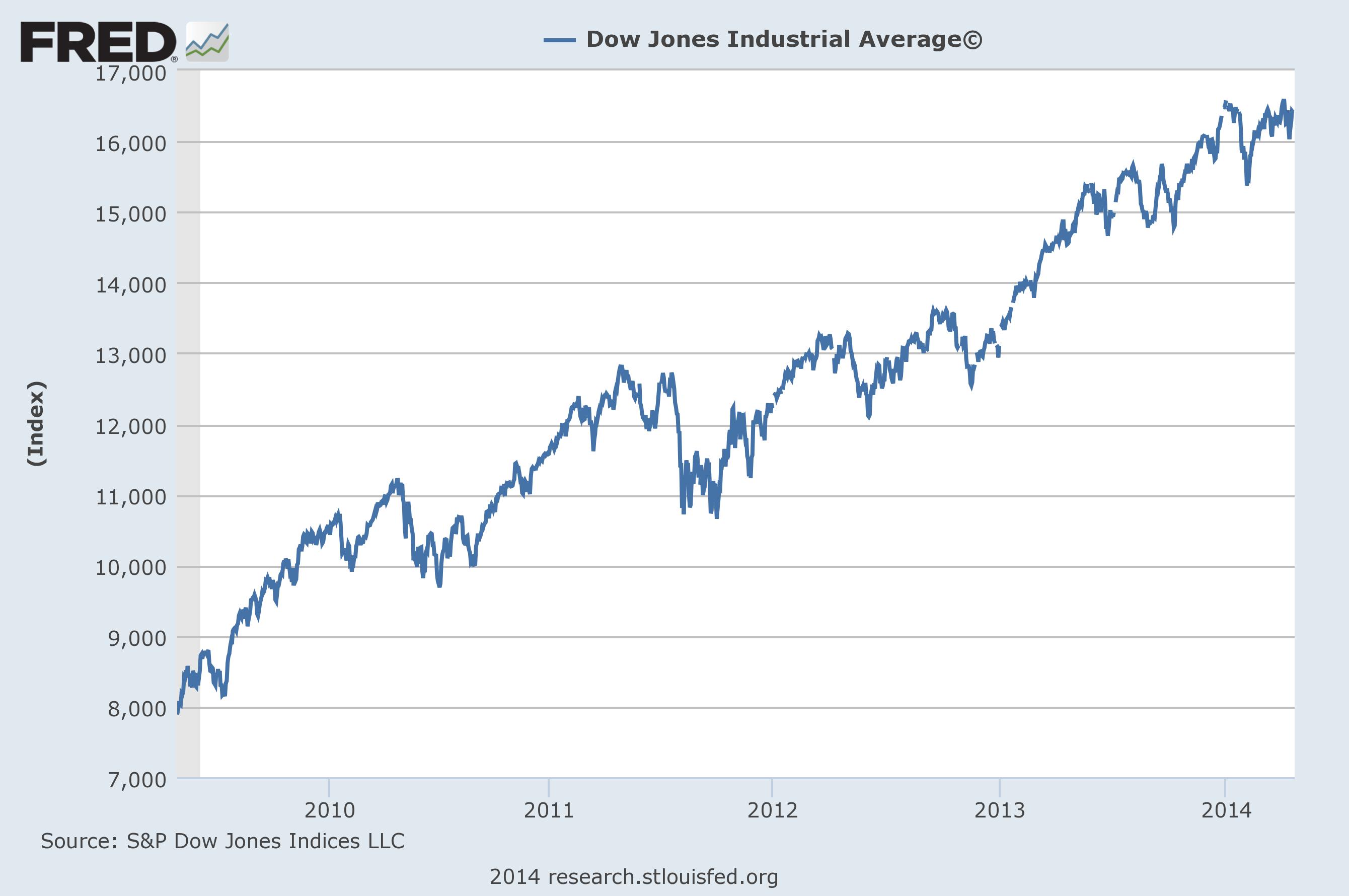Le ratio Dow Jones/Or est le favori des spécialistes du marché de l’or, pourquoi ? Parce que le rapport entre le plus important indice boursier au monde et le prix d’une once d’or exprimé en dollar, permet de savoir si l’évaluation de l’or est correcte ou pas ! Actuellement ce ratio tourne autour de 7 alors que normalement il devrait osciller entre 1 et 2. Une valeur tangible devrait valoir une autre valeur tangible. L’or est donc sous évalué ! Voici l’évolution du ratio Dow/Or depuis 1900 : Nous remarquerons que depuis l’année 2000, le ratio Dow/Or dégringole. Ce sont des périodes de faible retour sur l’investissement en bourse, de perte de confiance dans les actifs papiers mais surtout le recours à la sécurité que prodigue l’or qui a continué « tranquillement » sa progression tel que nous le démontre le graphique suivant : Toujours est il que le Dow Jones suit une escalade fulgurante (voir graphique ci-dessous), traversant de temps à autre quelques séances tourmentées par les annonces « fiction » de la Reserve fédérale relatives à une révision, une diminution voire même l’abandon de rachats d’actifs… Jusque là, les injections massives de billets n’ont pas revigoré l’économie réelle mais uniquement les marchés financiers, d’ailleurs le redressement fantôme de l’économie américaine en est largement témoin. Quand bien même le système d’impression monétaire dans un pays incapable de couvrir ses dépenses par manque de recettes suffisantes s’avère être un remède pour les marchés financiers, il n’en reste pas moins qu’il détruit le pouvoir d’achat. Au début de chaque cycle d’hyperinflation, les marchés explosent, ce qui veut dire que les Etats Unis empruntent désormais la voie hyper-inflationniste et c’est exactement ce qui se passe aujourd’hui ! Avec une augmentation de 19% des prix de la nourriture au premier trimestre 2014,  un taux de chômage élevé et des prévisions de croissance en trompe-l’œil, la situation parait franchement  inextricable. Le dollar s’affaiblit les ménages broient du noir, Wall Street plane et l’or garde son sang froid ! Le célèbre économiste et analyste en investissement Marc Faber, avait déjà lancé une première alerte en 2010 en disant que l’économie américaine allait traverser des périodes critiques et qu’il fallait mieux investir dans l’or, pour faire face à une aggravation éventuelle de la situation économique mais également sociale aux Etats-Unis. En 2011, celui-ci déclare que détenir de la dette en dollars est « un investissement suicidaire ». En 2012, il s’intéresse à l’évolution du ratio Dow/Or en disant la chose suivante : « Le cours d’une once d’or en dollars US et du Dow convergeront, je pense, vers ou autour de 1, à un certain moment au cours des prochaines années. J’en suis fortement persuadé ». D’après ses dires, les détenteurs d’or pourront donc s’offrir un Dow Jones contre une once d’or ! Actuellement, le Dow Jones tourne autour des 16000 points, l’once d’or touche les 1300 dollars et Faber continue d’être consulté et cité dans la presse spécialisée ! Alors Fed ou pas Fed, il ne reste plus qu’à sortir les calculettes…
