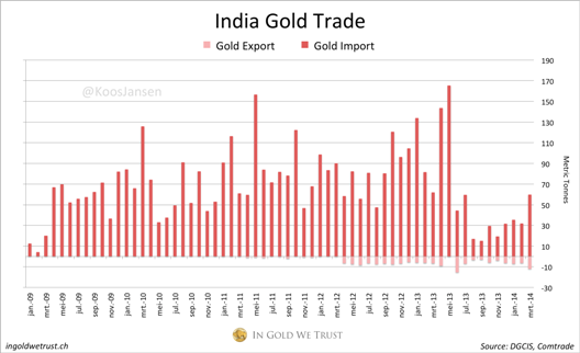 Il n’y a pas si longtemps, l’Inde affichait sa fierté en tant que leader de la consommation d’or. Mais voilà que le pays s’est vu rafler la mise par son voisin chinois l’an dernier et ce, après plusieurs décennies. La demande d’or en Chine selon le World Gold Council a enregistré un niveau record avec 1065,8 tonnes d’or contre 974,8 tonnes en Inde. Il faut savoir que les importations de métal précieux sont passées de 1013,9 tonnes entre avril 2012 et mars 2013, à 670,4 tonnes l’année suivante, soit 34% de moins en un an. Cette baisse s’explique en majeure partie par la politique restrictive imposée par le gouvernement indien sur l’importation d’or. D’ailleurs nous pouvons bien le voir sur le grahique ci-dessous : Il n’empêche que le World Gold Council estime qu’en 2014, la plupart des indiens poursuivront leurs achats d’or et probablement les augmenteront. En 2013, les achats d’or ont progressé de 11% à 613 tonnes, par rapport à 2012. Le World Gold Council a également déclaré que « l’or non officiel continuera sans doute à compléter les entrées officielles ». La même source indique que 250 tonnes d’or environ ont été introduites en contrebande. Et d’après des sources gouvernementales, seulement 1% de cet or a été saisi !  Au départ, ces restrictions ont été mises en place pour réduire le déficit de la balance commerciale sauf qu’elles se sont révélées être aussi un facteur de motivation énorme pour le développement de la contrebande ce qui est devenu un réel problème « politique » ! Ces derniers mois nous avons eu droit à différentes rumeurs concernant la baisse de ces droits cependant le gouvernement indien a annoncé récemment qu’il maintiendrait la taxe à 10% dans son budget fiscal, d’après l’agence Reuters. Pourtant Narendra Modi, l’ancien ministre en chef du Gujarat (Etat fédéré indien) de 2001 à 2014, devenu depuis le 26 mai dernier premier ministre de l’Inde, a basé toute sa campagne électorale sur la lutte contre la corruption. Ce dernier a permis au Gujarat grâce à sa politique, de réaliser un important taux de croissance. Il a également ouvertement critiqué le parti du Congrès au pouvoir d’entretenir la corruption avec des règles “anti-importation” sur l’or… Certes, le déficit courant a baissé, mais le niveau d’inflation reste très élevé, et le revenu par tête très bas, par conséquent les indiens préfèrent importer de l’or plutôt que d’épargner ! Rappelons tout de même que ce premier ministre libéral fraîchement élu, avait reçu le soutien des chefs de l’industrie joaillière en septembre dernier ! mais ça c’était avant … son élection !