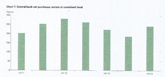 Les achats nets des banques centrales au cours de ce second trimestre ont totalisé 117,8 tonnes. Il s’agit du 14ème trimestre consécutif d’achats nets, soit 28% de plus par rapport à 2013. En termes de valeur, cela représente 4,9 Milliards de dollars. Et les achats d’or depuis le début de l’année s’élèvent à 242,1 tonnes. Les banques centrales des marchés émergents demeurent les principales acheteuses d’or avec la Russie (54 tonnes), le Kazakhstan (7 tonnes) et le Tajikistan (3 tonnes). Par ailleurs, le Mexique, la Serbie et le Kyrgyzstan ont également augmenté leurs réserves d’or, mais avec des quantités plus faibles (moins de 1 tonne). Un cas particulier cependant, celui de l’Equateur, qui a engagé ses réserves d’or dans un « swap » avec Goldman Sachs, en vue d’accroitre ses liquidités. Voici un graphique retraçant les achats d’or par les banques centrales depuis 2011: *H1 : première moitié de l’année Le second trimestre a été marqué par un élément clé, avec l’annonce d’un quatrième Central Bank Gold Agreement. Celui-ci a eu lieu le 19 mai dernier par les banques centrales de la zone euro, de Suède, de Suisse ainsi que la Banque Centrale Européenne. Dans le souci de clarifier leurs intentions par rapport à leurs avoirs en or, les signataires ont fait la déclaration suivante : « L’or demeure un élément important des réserves monétaires mondiales » « Les signataires continueront de coordonnées leurs opérations sur l’or afin d’éviter les perturbations du marché » « Les signataires n’ont aucunement l’intention de vendre des quantités d’or importantes » Cet accord s’appliquera à compter du 27 septembre après l’expiration du précédent accord, il sera revu au bout de cinq ans. Au cours de ce trimestre, les ventes d’or des banques centrales n’ont pas dépassé les 2,5 tonnes, avec une nouvelle fois l’Allemagne en tête, du fait de son programme de frappe de pièces d’or. Les évènements économiques et géopolitiques plongent le monde dans un climat chargé d’incertitudes et d’instabilité. Il est indéniable, à fortiori dans ce contexte, que les banques centrales continuent de vouloir gérer les risques de façon optimale à travers la diversification de leurs réserves…grâce à l’or !