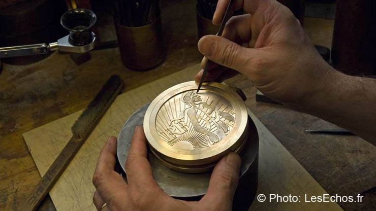 Tel un véritable artiste, le graveur se dispense de maquette, exécutant son oeuvre directement sur la matière définitive. Il procède généralement en creux, en réalisant son dessin d’origine à l’envers. Aucune erreur ne pouvant être corrigée, cette technique requiert une grande maîtrise. Des cylindres en alliage ultra-résistant sont ensuite gravés avant d’être usinés pour les adapter à la presse.