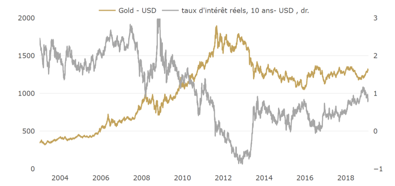 Scoop : chaque jour qui passe nous rapproche de la fin du cycle économique. Aux Etats-Unis, il s’agit de la plus longue période d’expansion de l’après -guerre. Logiquement les interrogations montent, et le thème du moment est celui du ralentissement économique. Tous les économistes, à l’instar de ceux du FMI, révisent leur prévision de croissance mondiale à la baisse. Chine, Europe, Etats-Unis, aucune zone n’est épargnée par des indicateurs en berne, notamment dans le secteur industriel. Ainsi en Europe, l’Allemagne a évité de justesse une récession technique au dernier trimestre. Tout ceci plaide pour des taux d’intérêts modérés, voire faibles. La Réserve fédérale fédérale américaine l’a bien compris et a annoncé une pause dans son cycle de resserrement monétaire. Avec des taux 10 ans autour de 2,7%, une nouvelle hausse des taux directeurs (déjà à 2.5%) aurait en effet inversé la courbe des taux (taux plus élevés à court-terme qu’à long-terme), un signal psychologique que le marché interprète fréquemment comme un indicateur de récession. La pause de la Fed est donc une bonne nouvelle pour l’or : les taux d’intérêt réels (hors inflation), qui ont baissé aux Etats-Unis depuis novembre, devraient rester bas. Traditionnellement, taux réels et cours de l’or sont fortement et négativement corrélés.