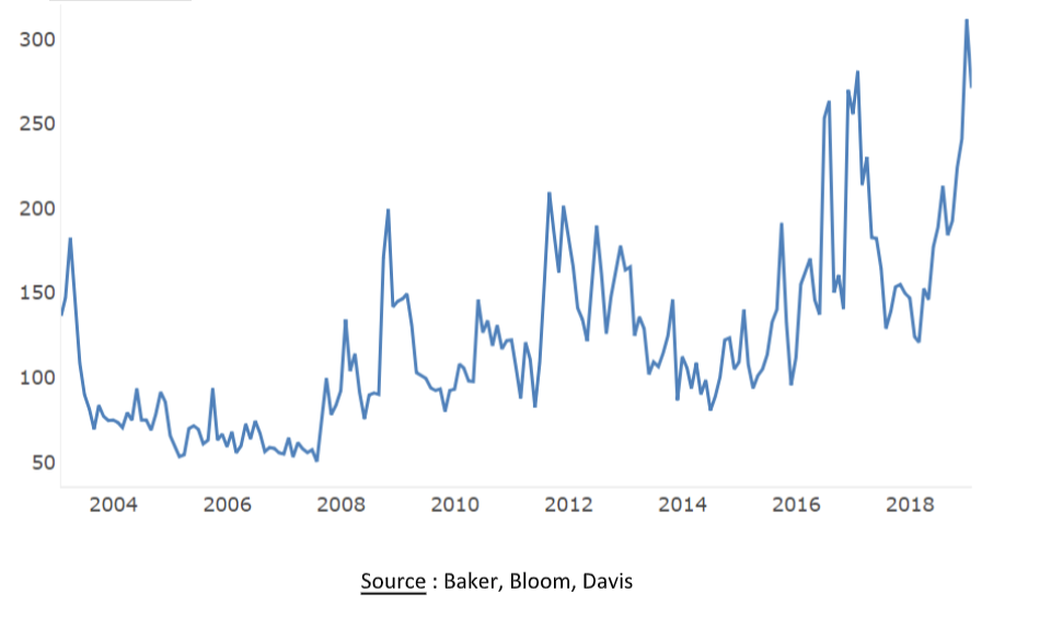 L’or est traditionnellement perçu comme un bon refuge contre le risque politique. Notre analyse le confirme tout particulièrement lorsque le risque ou l’événement en question est (1) imprévu ou peu anticipé, (2) crée une grande incertitude quant aux scénarios possibles et (3) que les conséquences économiques et financières sont potentiellement importantes. Le risque politique a été un thème majeur de 2018 et il le sera probablement encore en 2019. Les indicateurs de risque politique sont en très nette hausse ces derniers mois, en particulier en raison des sujets a dimension économique du moment : le Brexit et la guerre commerciale US-Chine.