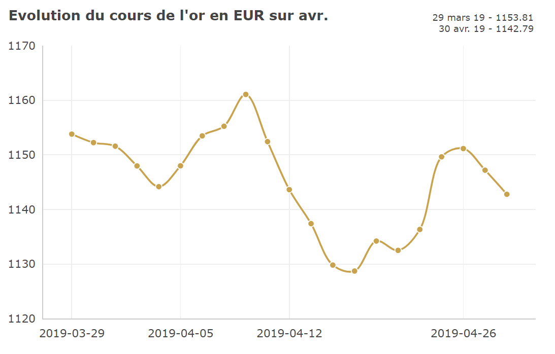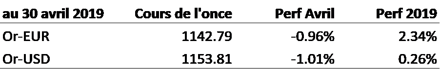 Une consolidation de 1% en euros sur le mois d’avril Au fixing de l’après-midi à Londres, le 30 avril, les cours du métal jaune ont clôturé à 1282.3 dollars et 1142.79 euros, en repli par rapport aux niveaux de fin mars. La baisse s’est concentrée entre le 10 et 23 avril où le cours en dollar a enregistré 7 séances baissières consécutives, avant de se ressaisir en fin de mois. S’il s’agit d’un deuxième mois de repli, la performance reste positive depuis le début de l’année, à +2.34% en euros. En dollars, la performance 2019 se situe proche de l’équilibre à +0.26%. La différence entre ces deux chiffres s’explique par une appréciation du dollar de 2% environ depuis le début de l’année.