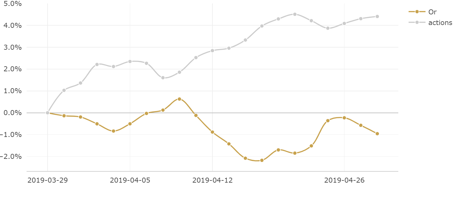 Graphique : performance comparée de l’or (en euros) et du Cac 40 en avril 2019