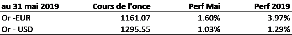 Une progression des cours de 1.6% sur le mois de mai Le 31 mai, les cours de l’or se sont établis à 1295.55 dollars et 1161.07 euros, au second fixing de Londres. Il s’agit d’une progression de 1% en dollar et 1.6% en euros sur le mois de mai. Cette bonne performance s’est surtout constituée en fin de mois ou le cours en euros a progressé de plus de 1.5% en 3 séances.