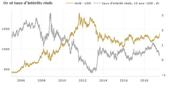 25-06-2019 La récente envolée des cours de l’or a poussé quelques banques d’investissement à revoir leurs prévisions de cours. A la hausse bien évidemment. Ainsi Morgan Stanley, la banque d’affaire américaine, voit désormais un cours moyen de 1435 dollars au 2nd semestre, et note que des taux réels américain en terrain négatifs pourrait « générer un potentiel de hausse considérable pour l’or ». Les taux réels à 10 ans sont en effet actuellement en dessous 0.3%, soit approximativement le niveau de référence lors de l’élection de Donald Trump de Novembre 2016. La baisse depuis le début de l’année, de près de 70 points de base, est particulièrement prononcée, et a soutenu l’envolée récente de l’or.