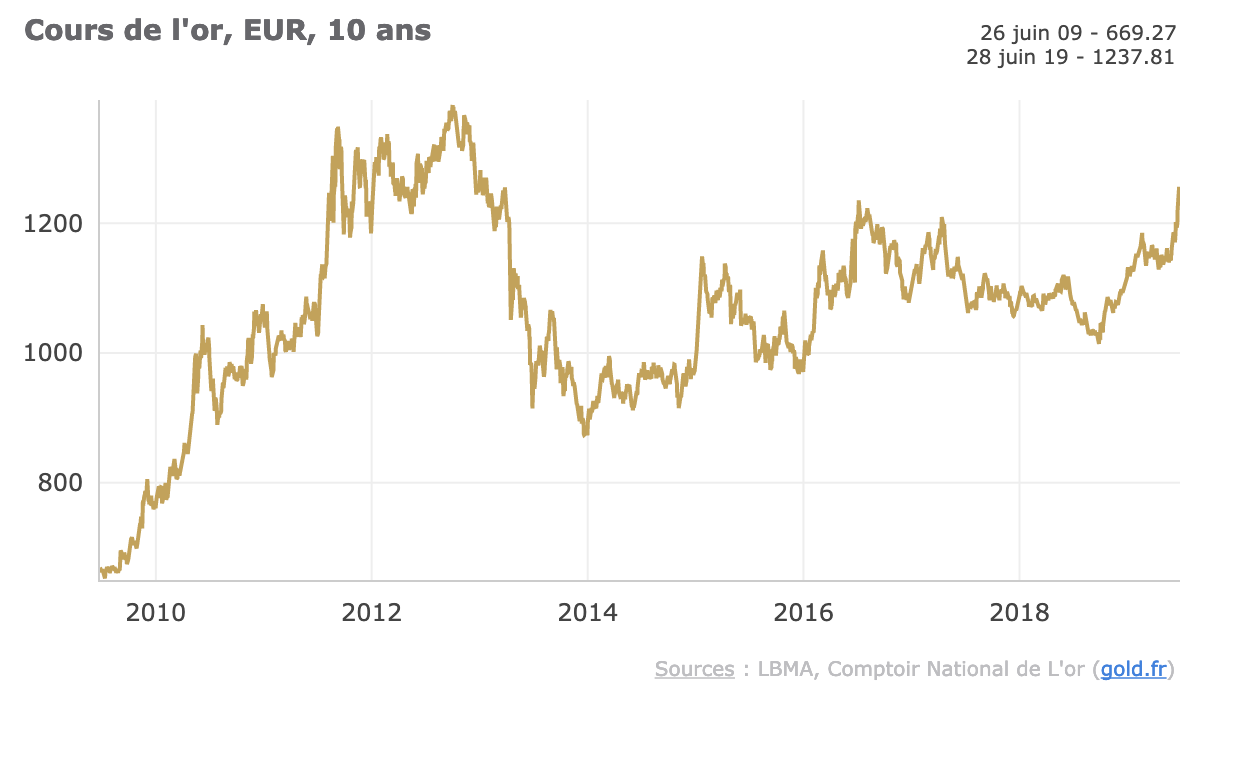 Envolée des cours : au plus haut depuis plus de 5 ansLe cours atteint même des plus hauts non vus depuis 2013 et semble ainsi sorti à la hausse du canal dans lequel il était enfermé depuis 2015. Ainsi, sur 10 ans, le métal jaune réalise une performance annualisée de 6.34%.