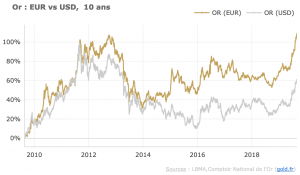 Si le métal jaune bat de nouveaux records en euros mais pas en dollar, cela illustre le fort écart de performance qui s’est creusé entre les deux monnaies. Ainsi, sur 10 ans, la performance en euro du métal jaune atteint.