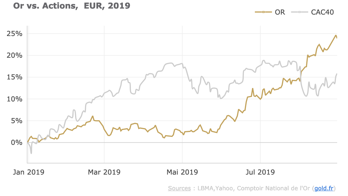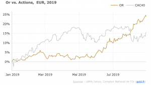 Au mois d’août, le CAC 40 ayant marqué un léger repli de 0.7%, le métal jaune a très nettement battu l’indice parisien avec une surperformance de près de 8.7%. Sur 2019, l’or repasse clairement devant les actions françaises et affiche une avance de près de 8%.