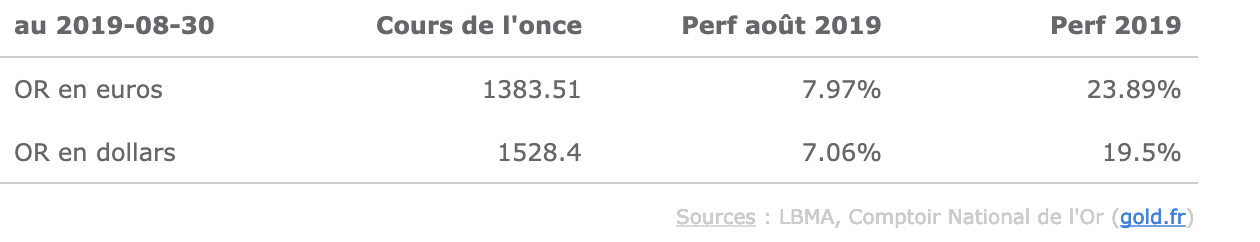 Au mois d’août, le CAC 40 ayant marqué un léger repli de 0.7%, le métal jaune a très nettement battu l’indice parisien avec une surperformance de près de 8.7%. Sur 2019, l’or repasse clairement devant les actions françaises et affiche une avance de près de 8%.
