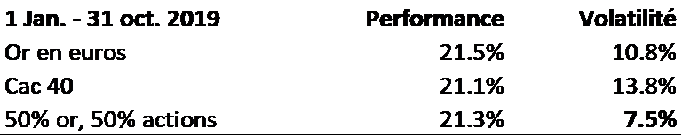 L’or et les actions (mesurés par le Cac40) ont des performances très comparables depuis de le début de l’année : +21.5% pour le métal jaune, et +21.1% pour l’indice parisien. Nous l’avions vu en septembre, l’or a néanmoins un meilleur couple risque rendement que les actions, en raison d’un risque (volatilité) plus faible. Mais qu’en est-il des propriétés diversifiantes de l’or ? Autrement dit, comment se serait comporté sur 2019 un portefeuille composé à 50% d’or et 50% d’actions françaises ?