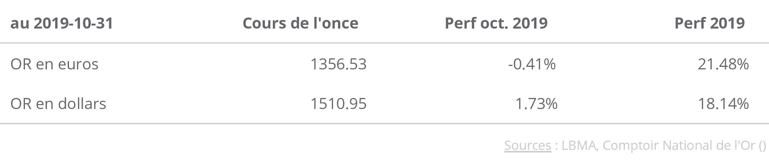 A la fin du mois d’octobre, le cours de l’once d’or est repassé au-dessus de la barre symbolique des 1500 dollars. Au second fixing de Londres, le 31 octobre, l’once a atteint 1510.95 dollars, soit 1356.53 euros. La performance sur le mois est de +1.73% en dollar, mais en raison d’une baisse du billet vert de plus de 2% sur le mois, la performance en euros s’établit à -0.4%.