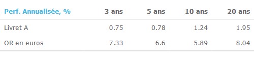 L’autre actif qui est connu pour ses propriétés de protection contre l’inflation, c’est l’or. Sa performance brute est très nettement supérieure à celle du livret A sur toutes les périodes (voir le cours de l’or), même si celui-ci n’est pas fiscalisé. Mais surtout, même si certaines années peuvent être négatives, sur le moyen et long terme sa performance est largement supérieure à l’inflation qui a en moyenne atteint environ 1.4% par an depuis le début des années 2000.