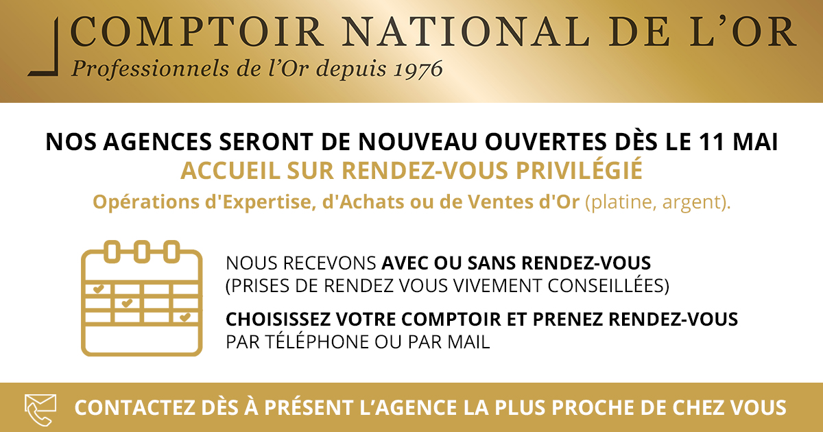 NOS AGENCES RÉOUVRENT DES LE 11 MAI 2020. Compte tenu du contexte exceptionnel sur les marchés financiers et de la situation de blocage créé par le Coronavirus en France, le Comptoir National de l’Or met en place un standard téléphonique vous permettant de continuer à réaliser vos opérations d’investissement. Vous pouvez dès à présent contacter vos comptoirs et prendre rendez-vous. Merci de contacter directement votre agence la plus proche, à l’aide des informations ci-dessous :