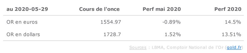 Sur les 5 premiers mois de 2020, la performance de l’or atteint 14.5% en euros, et place toujours le métal jaune parmi les meilleurs classes d’actifs de l’année. Au terme d’une bonne première quinzaine, le cours a franchi la barre des 1604 euros l’once en milieu de mois, frôlant ainsi le record historique de 1608 euros atteint le 23 avril dernier. Le cours a ensuite corrigé sur la deuxième quinzaine du mois, periode qui correspond aussi à une dépréciation du dollar contre euro.