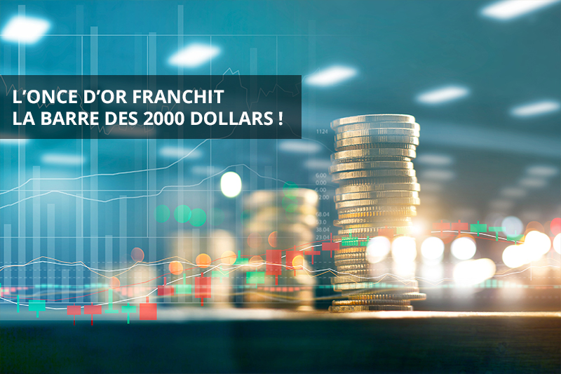Le cours de l’or continue sa progression et a franchit la barre symbolique des 2000 dollars. Il cote désormais aux alentours de 2050 dollars, soit environ 1730 euros. Il s’agit d’une appréciation de presque 27% en euros depuis le début de l’année. Difficile de dire si cela va continuer à court terme, les fortes envolées ayant parfois besoin d’une consolidation pour durer. Mais les cours sont soutenus par une forte demande d’investissement liée aux incertitudes actuelles. Du côté des professionnels de l’investissement, tous ou presque incorporent de l’or à leurs portefeuilles, comme Lombard Odier qui dans une note recommande à ses clients d’ajouter du métal jaune pour augmenter « la résilience des portefeuilles ». A noter enfin, si nombres d’analystes avaient prévu que le métal jaune franchirait le cap des 2000 dollars, certains, comme Bank of America, parlent désormais du prochain pallier à… 3000 dollars.