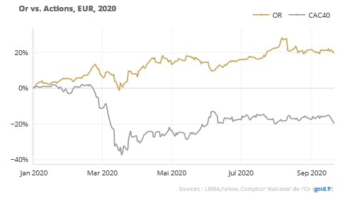 Hier, en ce premier jours d’automne, les marchés ont enregistré une forte correction : près de -4% pour le Cac 40 et des baisses significatives pour les autres indices européens. L’accélération de la pandémie en Europe, la crainte d’un reconfinement, ainsi que des mesures de soutien économique au point mort aux États-Unis ont pesé sur les cours (cours de l’or inclus). L’or a également fortement corrigé de près de 3% en dollars, sous l’effet de liquidation de position bénéficiaires à l’approche de la fin du trimestre. Mais en raison d’une appréciation du billet vert, l’or en euro n’a reculé que de 1.4%. Cette correction pourrait inquiéter, et une poursuite de la baisse n’est pas à exclure. Il faut néanmoins prendre du recul : alors que le Cac40 recule de 4.2% en septembre, l’or ne perd que 1.4%. Et depuis le début de l’année, alors que les actions françaises PERDENT plus de 19%, le métal jaune, lui, GAGNE plus de 19%.