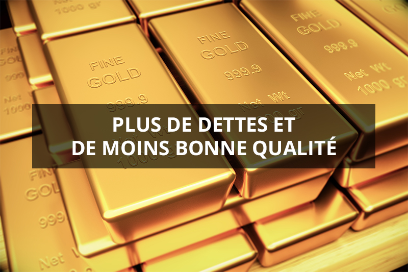 Il semble que la réalité économique et financière est en train de rattraper les emprunteurs du monde entier. Les agences de notations (S&P Global, Moodys, Fitch, etc) sont en train de lancer une vague de révisions à la baisse de leur notation de crédit. Cela concerne d’abord les Etats. Le directeur des notes souveraines S&P global indiquait récemment à Reuters que son agence avait abaissé les notations ou les perspectives sur la dette de 60 pays. Cela concerne pour le moment principalement les pays les plus fragiles, mais pas seulement. Ainsi, sur fonds de crise sanitaire et d’incertitude liée au Brexit, le 17 octobre, l’agence Moodys a abaissé la note de la dette du Royaume-Uni d’un cran. Autre exemple : alors que le déficit budgétaire américain clos au 30 septembre a dépassé les 3000 milliards de dollars, l’agence Fitch a quant à elle annoncé qu’elle pourrait revoir à la baisse la notation des Etats-Unis si les résultats de l’élections étaient contestés et créait une incertitude politique importante. Une chose est certaine : face à la montagne de dette, et une économie plus moribonde qu’espérée, la solidité financière des emprunteurs est mise à mal. L’alternative : l’or qui est le seul actif à n’être le passif de personne.