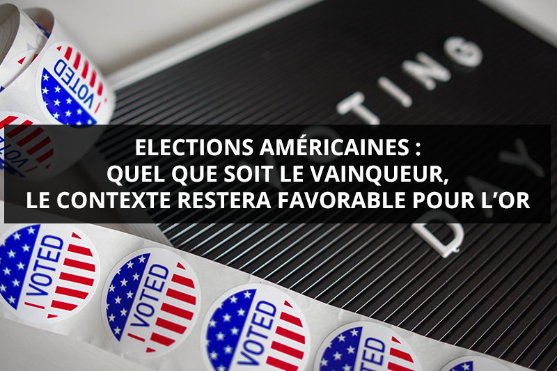 A l’heure d’écrire ces quelques lignes, et malgré la déclaration du président Trump clamant la victoire, le résultat final de l’élection présidentielle américaine semble difficile à déterminer. La vague démocrate ne semble pas avoir eu lieu, et on s’achemine vers des résultats incertains et des batailles juridiques, allant possiblement jusqu’à la cour suprême. S’ajoute à ceci les résultats serrés des élections sénatoriales, qui peuvent donner (ou non) une majorité au nouveau président. Mais dans quelques heures, jours ou semaines, l’agitation retombera et un vainqueur sera désigné. Et lorsque l’on nous demande ce que la victoire de Trump ou Biden pourrait changer pour l’or, au Comptoir National de l’or, nous préférons parler vers ce qui ne changera pas. Quel que soit le vainqueur, l’or continuera à évoluer dans un contexte favorable fait de taux bas (voire négatif en termes réels), de déficits et dettes publiques gigantesques et de planche à billet qui tourne à plein régime dans un contexte. La Réserve Fédérale américaine a déjà indiqué qu’elle maintiendrait sa politique extrêmement accommodante jusqu’en 2024 et qu’elle était prête à laisser filer l’inflation. Et quel que soit le vainqueur, rien ne laisse envisager une réduction du colossal déficit budgétaire américain, qui a dépassé les 3000 milliards sur un an. Les deux candidats ont dans leur programme des mesures de stimulation de l’économie importantes qui sont de nature à creuser les déficits. Quel que soit le vainqueur, les ravages sanitaires et économiques de l’épidémie de Covid-19 ne s’estomperont pas soudainement aux Etats-Unis et dans le monde comme par magie. Les entreprises restent fragilisées, les faillites se produiront, et le chômage restera élevé pour un moment. Quel que soit le vainqueur, la situation géopolitique de fonds ne changera pas fondamentalement, et la confrontation US-Chine perdurera, peut-être sous des façades plus cordiales avec une présidence Biden, mais sans fondamentalement changer la situation de fonds en Mer de Chine du Sud, à Taiwan et Hong Kong. Quel que soit le vainqueur, il aura à faire avec des leader ou régimes « durs » qui sont bien installés en Iran, Russie, Turquie, Corée du Nord et Chine. Si à court terme on peut constater une volatilité des marchés et des cours de l’or, dans un sens ou l’autre en fonction des configurations, il ne faut pas oublier que le métal jaune est avant tout une histoire de long terme.