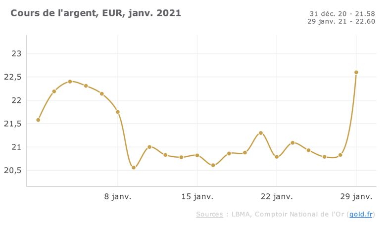 S’il est un métal précieux comme l’or, l’argent a pourtant des caractéristiques propres. Il est beaucoup plus proche d’une matière première industrielle en raison de ses applications médicales, électroniques, et environnementales. Il a donc la particularité d’avoir une demande industrielle significative, une demande qui en ce moment se porte plutôt bien. Après une année 2020 où le métal s’est apprécié de 34% en euros (47% en dollars) l’argent entame l’année sur les chapeaux de roues avec un gain de 4.73% sur le mois écoulé. Une performance particulièrement importante le dernier jour du mois (+8.5%) en raison de l’afflux d’acheteurs particuliers, influencés par les réseaux sociaux (cf. ci-dessous). Le 1er février, le cours de l’argent s’est encore apprécié de presque 10%, atteignant un plus haut de huit ans, avant de corriger fortement.