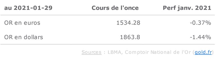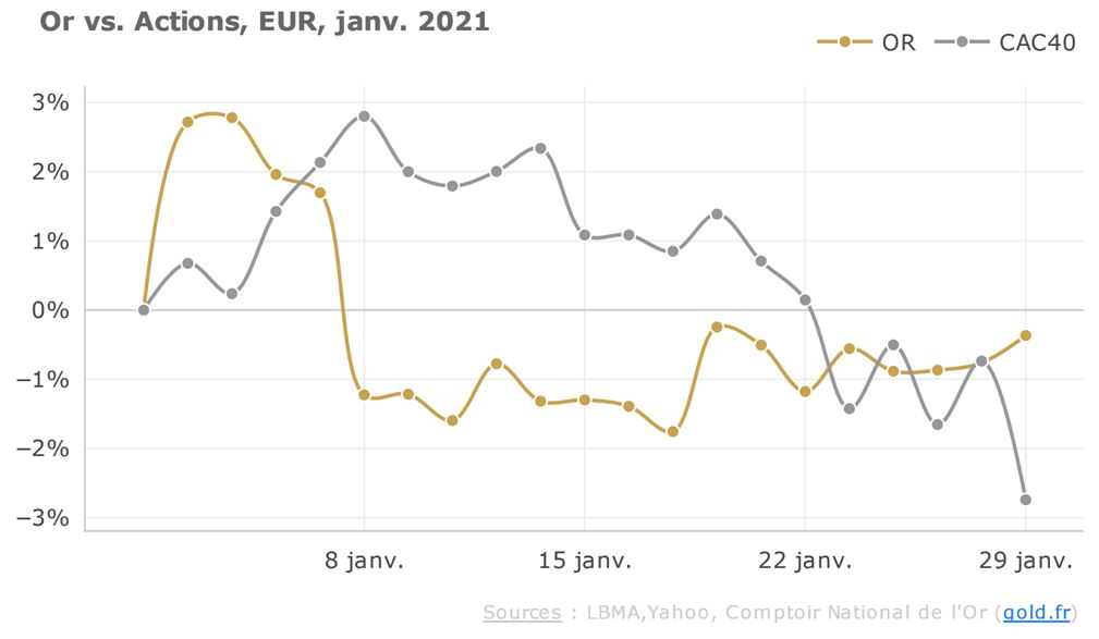 Le métal jaune a fait mieux que les actions de l’indice CAC40, qui se sont repliées de 2,7% en Janvier. L’écart de performance en faveur de l’or est donc de +2,4%. Après l’optimisme de la première semaine de l’année, le doute est revenu envahir les esprits et l’indice parisien a effacé ses gains sur fonds d’inquiétude sur les valorisations élevées des marchés et d’émergence des variants du coronavirus.