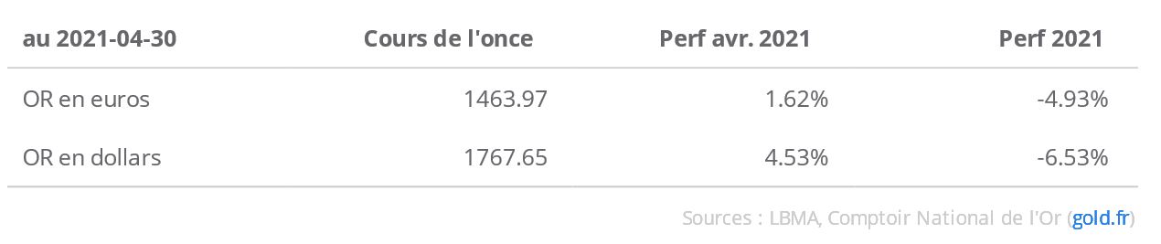 Après un mois de mars plutôt calme, le cours de l’or a progressé significativement en avril. En dollars, l’once d’or s’est appréciée de près de 4.5% pour atteindre 1767.65 dollars au second fixing du 30 avril à Londres. Le cours atteint 1463.97 euros et affiche une performance de 1.62% dans la monnaie unique. Malgré ce rebond, la performance pour l’année reste en terrain négatif, à près de -5% en euros, et -6.5% en dollars