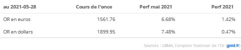 Le 28 mai, dernier jour ouvrable du mois à la bourse de Londres, le cours de l’or a clôturé à un niveau de 1899.95 dollars, en hausse de 7.48% sur le mois. En euros, la progression en mai est de 6.68% pour atteindre un cours de 1561.76 euros. Grâce à cette très forte performance (le meilleur mois depuis un an), la performance du métal jaune depuis le début de l’année repasse en terrain positif, et atteint +1.42% en euros.