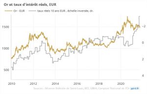 Ce différentiel de taux d’intérêt réel entre les USA et les l’Europe est une des raisons pour lesquels le cours de l’or en euro se comporte mieux qu’en dollars, en lien avec l’appréciation du billet vert.