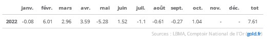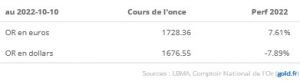 Table 1 : performance mensuelle de l’or en euros, 10/10/2022