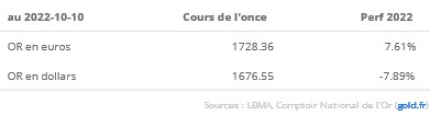 La bonne performance sur 2022 s’explique largement par la forte appréciation du dollar. Une appréciation qui se poursuit en raison de la remontée rapide des taux aux Etats-Unis et du contexte international difficile. Le cours de l’once en dollar est lui dans le rouge depuis le début d’année (-6.8%) et atteint 1676.55 dollars.