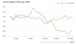 durant la baisse récente des marchés. Entre le 12 et le 29 septembre le CAC40 a enregistré 10 séances de baisse sur 12, pour une perte totale de près de 10%. Dans la même période, le métal jaune n’a cédé que 0.4%…