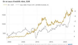 l’inflation, la perspective de hausse des taux fait que les acteurs de marché s’attendent à une hausse des taux d’intérêts réels. Et le métal jaune est traditionnellement négativement corrélé à ces derniers.