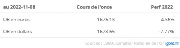 Table 1 : performance mensuelle de l’or en euros, 08/11/2022