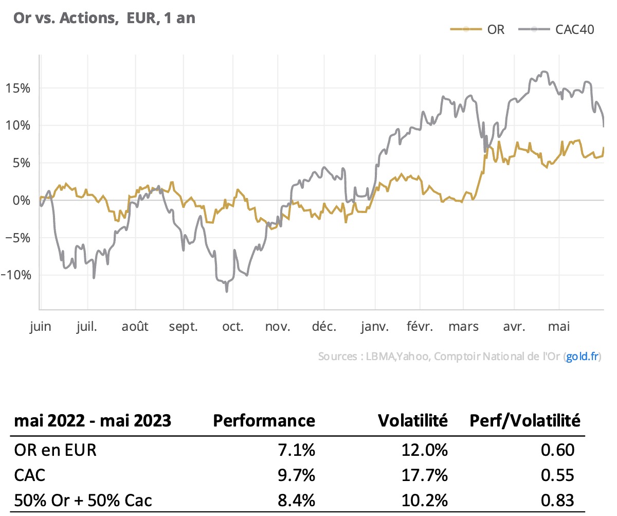 Sur un an, l’or fait moins bien que le cac 40 hors dividendes (7.1% contre +9.7%). Mais il est nettement moins volatile que l’indice parisien (30% de moins environ) ce qui lui donne un couple risque rendement plus favorable.
