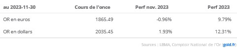 Fin novembre, au fixing de Londres, le cours du métal jaune atteint respectivement 2035 dollars et 1865 euros. Cela correspond à une appréciation sur le mois de près de 2% en dollar, mais sous l’effet de la dépréciation du billet vert, le cours en euros recule de 1%.