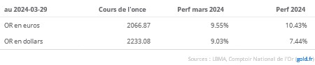 En dollar, l’once s’apprécie de 9% sur le mois et de 7.4% en 2024 avec pour atteindre un cours de 2233, avec la aussi plusieurs records historiques battus atteints au fil des séances de hausse.
