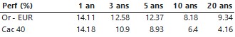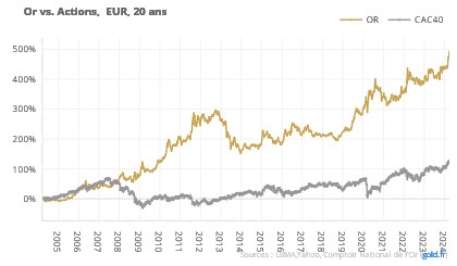 A plus long terme, les performances annualisées du métal jaune sont supérieures à l’appréciation du CAC 40 hors dividendes. Avec plus de 9% par an sur 20 ans, l’investisseur qui a investi sur l’or en 2004 a multiplié son capital par 6.