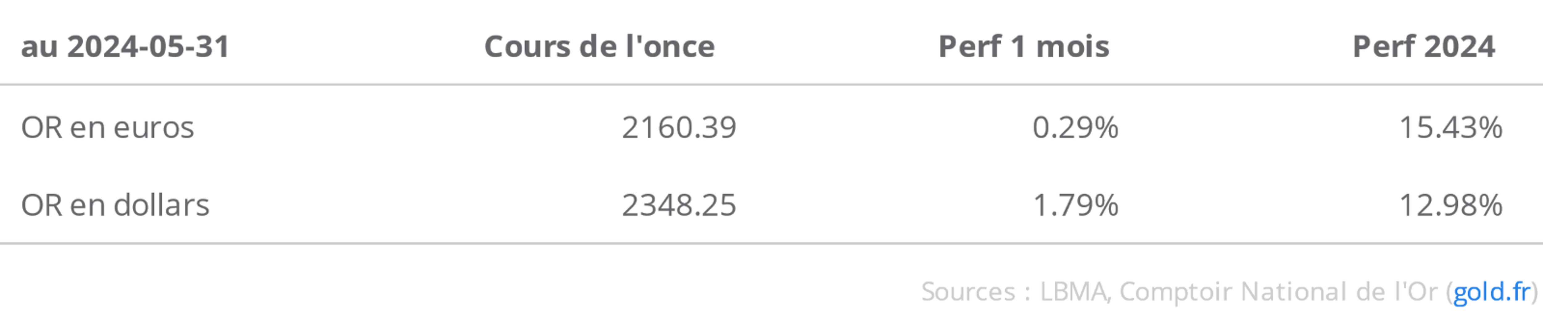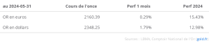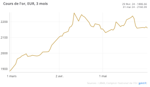 Le cours de l’or en euro a progressé de 0.29% sur le mois pour s’établir à 2160 euros l’once au second fixing de Londres du 31 mai. Depuis le début de l’année, la progression du cours atteint 15.43%.