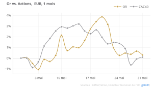 L’or et els actions se sont comportés de manière relativement similaire sur le mois. Les relativement bonnes nouvelles économiques, pointant une économie mondiale plus dynamique qu’attendue, sont venues refroidir les attentes de baisse de taux d’intérêt des marchés, pénalisant le métal jaune et les marchés action sur la deuxième moitié du mois. D’autant que le compte rendu publié le 22 mai de la dernière réunion de la réserve fédérale a indiqué que plusieurs membres jugeaient une hausse des taux possible au regard d’une inflation encore élevée.