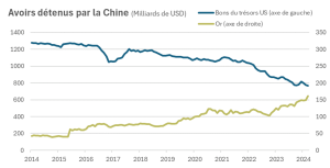 Parallèlement, les avoirs en or de la banque centrale chinoise atteignent 160 milliards de dollars, en progression de 30 milliards sur un an, et de 110 milliards en 10 ans. En clair, la Chine remplace environ un quart de ses bons du trésor américain par de l’or.