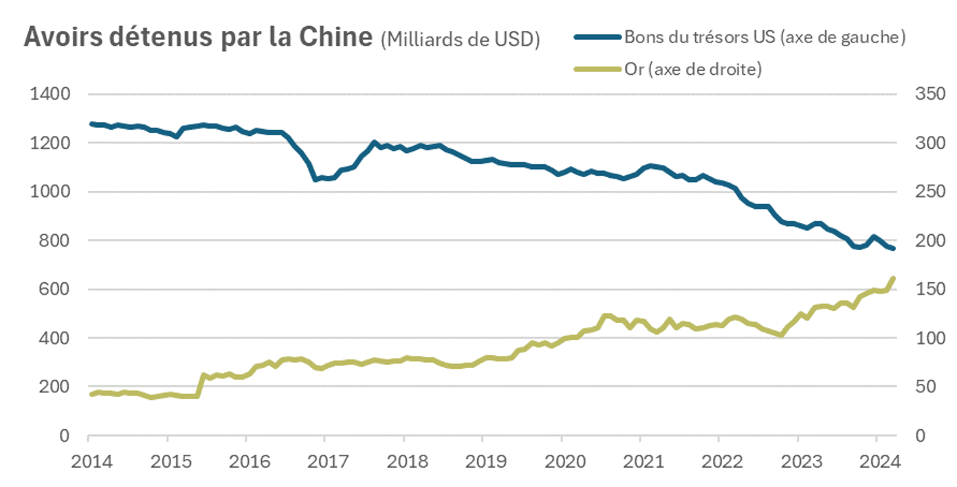 La dédollarisation se poursuit en Chine. En mars 2024, selon le trésor américain, la Chine détenait 767 milliards de dollar de bons du trésor américain. C’est 100 milliards de moins qu’en mars 2023, et c’est 400 milliards de moins qu’il y a 10 ans.