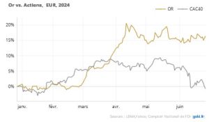Sur 2024, au 9 juillet, le CAC40 affiche même une performance légèrement négative (-0.35%), ce qui signifie que le métal jaune surperforme les actions françaises de plus de 17%.